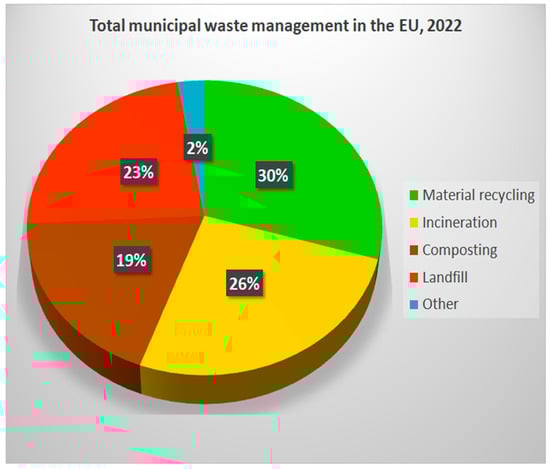 In 2022, the latest recorded municipal waste treatment and management data for the EU were formally published. Specifically, during this year, 68 million tonnes, or 30% of the total annually generated municipal waste, was recycled, while 43 million tonnes, or 19% of the total annually generated municipal waste, was composted. Additionally, during the same year, 53 million tonnes, or 23% of the total annually generated municipal waste, was landfilled, and 59 million tonnes, or 26%, was incinerated, either for energy production purposes or for other reasons. Lastly, 6 million tonnes, or 2% of the total generated municipal waste in 2022, was recorded as missing data or treated by other formal or informal means []. Figure 5 reveals the overall picture of these percentages regarding municipal waste treatment and management within the EU in 2022.