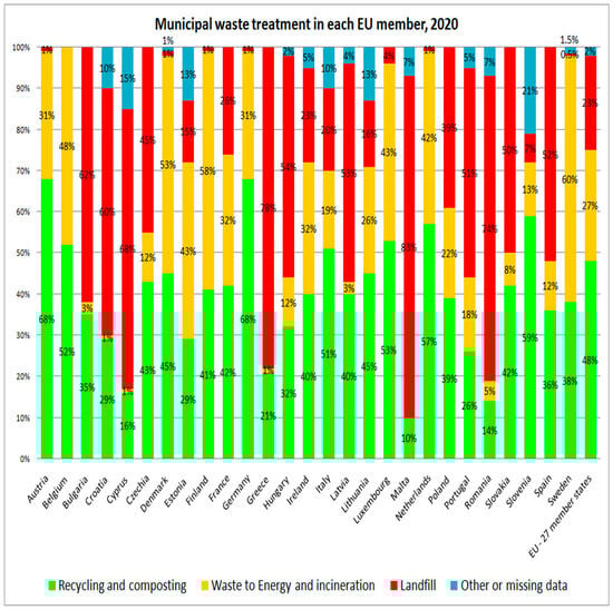 Municipal waste treatment and management practices within each EU member state in percentages in the year 2020 [].