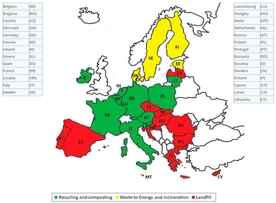European map with each EU member colored regarding its most widely implemented municipal waste treatment and management strategy. Source: Modified and created by data of [].