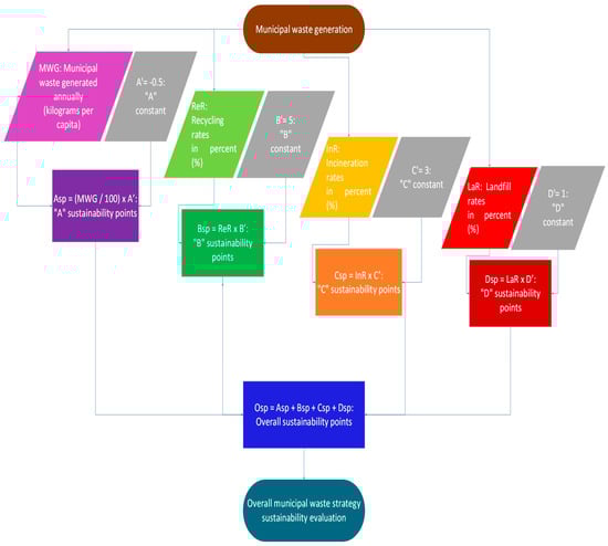 In summary, the logic of this newly created point system is to rank and compare all EU members according to their different implemented municipal waste treatment and management strategies and in full agreement with the five-stage waste hierarchy of Directive 2008/98/EC. In particular, this point system was carefully devised in order to reward EU countries that record the highest recycling rates and the smaller per capita annual generation of municipal waste with as many sustainability points as possible. At the same time, it avoids, to some extent, giving negative sustainability points to many EU members that implement less sustainable municipal waste management strategies. The following flow chart in Figure 8 briefly explains the mathematical logic of this new sustainability evaluation system. Ideally, the maximum/ideal number of sustainability points that an EU member state can potentially gain, based on this new sustainability point system, is Ospmax = Asp + Bsp + Csp + Dsp = −1.50 + 5 + 0 + 0 = 3.50 municipal waste management sustainability points.