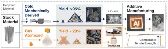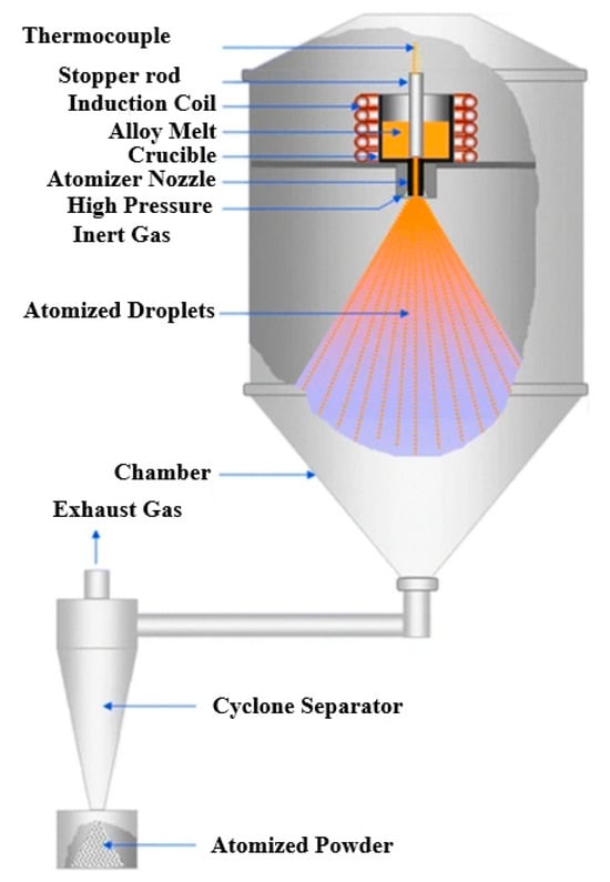 Material chips can also be recycled by using a method like gas atomization (GA) in which the material is heated to a melting point in the atomization process, and a nozzle of plasma or flowing gas breaks the liquid metal into fine particles, and they form spheres because of surface tension as they cool and fall through the atomization chamber []. Figure 14 shows a GA system. Chips can be recycled and developed into powdered form using GA. These powders can be used in additive manufacturing processes like powder bed fusion and wire arc direct energy deposition. Cacace et al. [] used recycled AISI 316L and standard AISI 316L to produce powders using the GA process. They studied the feasibility of using recycled materials to produce powders for additive manufacturing. The results indicated that AISI 316L can be used for additive manufacturing, and it resulted in high mechanical properties and good processibility. Lagutkin et al. [] developed a new method which combines pressure and gas atomization. White et al. [] used a close coupled high pressure gas atomization method to produce a narrow distribution of coarse, spherical powders for Ni-based super alloys. Heidloff et al. [] used close-coupled gas atomization for the production of fine spherical powder from the Ti alloy.