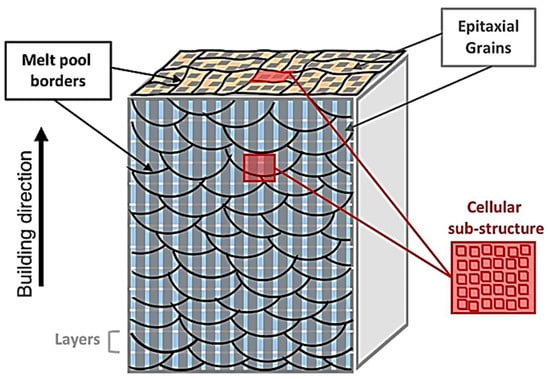 Aluminum (2024,6061,7075), stainless steel (SS304,316,316L), super alloys, and titanium alloys (Ti6Al4V) are used in aerospace [], nuclear, and marine industries due to their properties like tensile strength and corrosion resistance. Due to high fatigue resistance, aluminum 2024 is commonly used in aerospace development []. Essentially, enriched aluminum–uranium alloys are used in nuclear reactor fuel elements [], whereas in the marine industry they are used to increase the payload and fuel efficiency []. Titanium and titanium alloys are widely used in the aerospace industry for building aircraft frames and engine parts [], and in marine applications for deep diving vehicles and submarines for producing pressure shells [,] and propellers []. In the nuclear industry, it is used for storing nuclear waste due to its chemical properties []. It can also be used to design nuclear reactor shields [,]. Stainless steel is used in the aviation industry for developing landing gear components, wings, and engines []. Nickel-based super alloys are used in the development of aircraft exhaust valves and turbine rotors due to their high creep resistance at higher temperatures []. Research has been carried out on improving the microstructure and mechanical properties of stainless-steel alloys [,,,,,,], aluminum alloys [,,,,,,], titanium alloys [,,,,,,,,,,,,,,], and nickel-based super alloys [,] using different techniques like adding carbides [,,,], alloying elements [,,,], and heat treatments [,,]. Conventional fabrication involves multiple processes and is time consuming. To streamline the fabrication process, industries are looking towards the new upcoming technology of additive manufacturing, which involves adding layer by layer of material for 3D printing of parts [,,]. Different types of materials like plastics [,], concrete [,], composites [,], elastomers [,], polymers [,,], metals and alloys [,,,,,,], and non-metals [,] can be used for developing components. Commonly used 3D printing processes for stainless steel alloys, aluminum alloys, titanium alloys, and super alloys are laser powder bed fusion (LPBF) [,,,,,,,,] wire arc direct energy deposition [,,], laser metal deposition [,], and additive friction stir deposition [,,] processes. The current research in additive manufacturing on aluminum alloys [,,,,,,,,,,,], stainless steel [,,,], titanium alloys [,,,,,,,,], and nickel-based super alloys [,,,] aims at improving the microstructure and mechanical properties of materials by reducing the defects [,,] in additive manufacturing. To optimize the cost and material utilization with a focus on sustainability, research has been carried out to recycle the material waste that is generated during the machining operations in industries while developing components. Direct recycling of metallic components or local production of powdered metal from readily available stock, including rod, machine chips, and wires, offers several benefits. These include reduced onsite powder storage, reduced lead times, increased availability of new alloys, waste reduction, and improved industrial hygiene (Figure 1) []. Currently, research is being carried out on recycling material waste in the form of chips/powders for use in additive manufacturing processes [,]. Figure 2 shows a typical LPBF microstructure. Figure 3 shows the generation process of the melt pools along the build direction during direct metal laser sintering process. In this paper, we review the recycling methods of materials through conventional and direct conversion methods and propose a way of recycling by converting material chips into wires for additive manufacturing process which can be energy efficient and environmentally friendly.