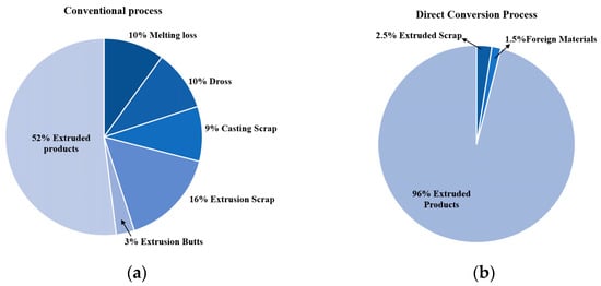 Increasing raw material and energy costs have led researchers to find alternative ways to recycle metal waste []. Chips are formed during machining operations like turning, milling, drilling, grinding, cutting, and sawing. There is a possibility for these chips to get chemically contaminated by coolants and emulsions during machining operations, hence they require a cleaning process before recycling. In direct conversion methods, chips are recycled without melting using solid-state recycling techniques [,], whereas in conventional methods [], chips are melted for recycling, and it is important to understand this recycling process for different materials, as direct melting of some chips like aluminum alloys, which are covered by small layer of can be detrimental. It has been reported that aluminum alloy chips below the dimensions of 420 µm suspended in air or deposited in the form of a layer pose a risk of exploding if put in contact with an ignition source []. A comparison between the percentage of product extruded by conventional (52%) and direct conversion methods (96%) can be observed in Figure 4. Further discussions explore the chip cleaning process, conventional, direct conversion methods, powder metallurgy, and billet compaction for material recycling.
