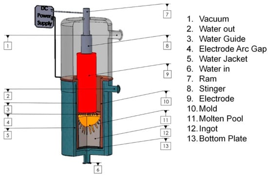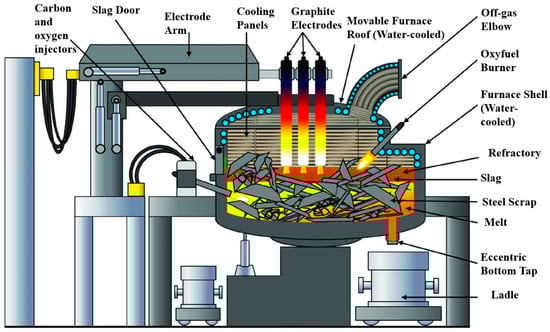 Iron and scrap are reduced from iron ore charged in the furnace. The furnace is refectory lined by a material which is infusible and heat resistant up to the highest temperature of steel making process. The heat is supplied by an arc which is created when the electric current is passed by carbon electrodes through the scrap to the furnace lining. Natural gas and oxygen can be used for providing additional heat to aid the melting process. Figure 6 shows an EAF process. Yang et al. [] used an electric arc furnace to recycle stainless steel industrial waste and examined the effects of test conditions on carbon reduction of oxides in briquettes. Based on the observations, suggestions were made for the smooth operation of smelt reduction of briquettes using EAF or induction furnace. LAT et al. [] recycled the zirconium alloy chips using two different techniques. One of the techniques used was melting the chips in EAF to obtain ingots which were heat-treated. A very high (up to 20%) burnout/oxidation loss can result due to remelting scrap in the electric arc furnace or the induction furnace [,,,]. Pereira et al. [] recycled zirconium alloy chips using EAF. Hekimoğlu et al. [] remelted the 390 A alloy and observed a uniform and equiaxed distribution of grains.
