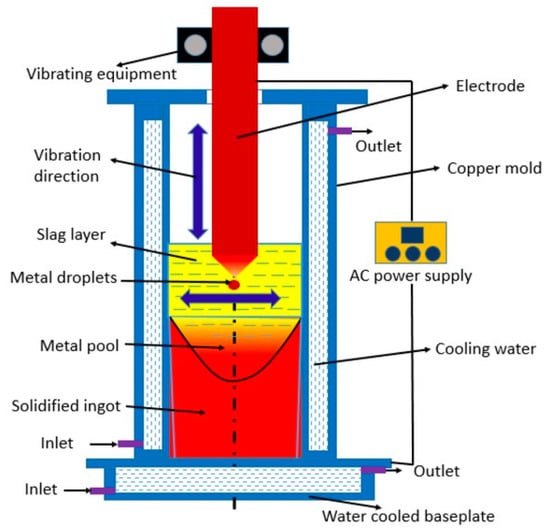 Vacuum arc remelting is commonly used to purify various alloys like nickel-based alloys, titanium-based alloys, and stainless-steel alloys. This method refines an impure alloy (electrode) through vacuum heated by a DC arc. As the tip of electrode melts, it generates droplets which drip through the vacuum and reach the molten pool. A high grade ultra-clean alloy forms in a water-cooled mold as the molten pool solidifies. Low density oxide inclusions are carried to the molten pool by the droplets and are transferred to the solidification rim near the mold. Figure 8 shows a VAR process. Under the vacuum conditions, unfavorable elements with high vapor pressure like Cu, Pb, As, Bi, Sn, and Te are evaporated under vacuum conditions []. To produce alloys used in nuclear fuel parts, the nuclear industry accepts only VAR furnaces as acceptable technology [,]. Ries et al. [] studied the recycling of zirconium alloy chips scraps by melting in a VAR furnace. Kramer et al. [] have described the process of recycling titanium chips. One of the steps mentioned is turning chips into stable compacts which can be remelted using a consumable electrode vacuum arc furnace. Berggreen [] discusses the properties of titanium chips to be considered before remelting. The consumable electrode which is used in ESR and VAR furnaces is built using vacuum induction melting, in which a casting technique of pouring into top open mold is used. A substantial density of serious cracks is developed despite vacuum due to oxidizing conditions and turbulence accompanying the top pouring of the electrode. The biofilms (double oxide films), which are the cracks in the cast electrode, are responsible for major faults like fallen crown, white spots, and undetectable and horizontal macroscopic cracks in the VAR ingot. The solutions recommended to resolve these issues are a counter gravity cast electrode or an electrode cast in a vacuum or air such that it will be free from bifilm defects [].