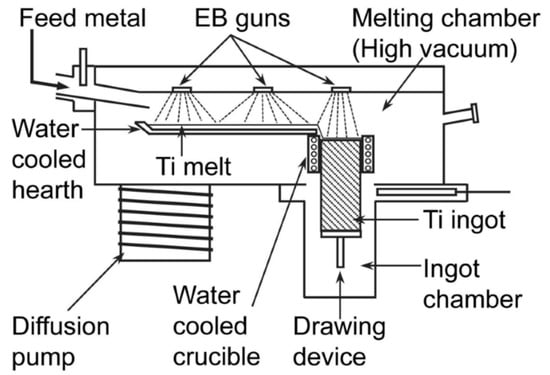 EBM and refining process were developed as possible sole procedures for the processing of refractory and chemically active metals like Mo, W, Ti, Nb, Ta, Zr, Hf, V, and Pt, and now they are used for production of high purity metals and alloys in a vacuum and for recycling material scrap [,,,,]. Figure 9 shows an EBM process. The beams in electron beam melting furnace are generated due to the emission of free electrons, and are accelerated under electrostatic field. These beams are targeted on the material to be processed. The beam energy converts into thermal energy, as the kinetic energy of the electron is deposited into the target, which leads to the melting of the material []. The material is not overheated with electron beams, which results in a high level of purification of metals from gases and metallic or nonmetallic admixtures, and results in the preservation of the structure, chemical composition, and properties of finished metallic ingots. The use of a water-cooled copper crucible for refinement, melting, and solidification helps in avoiding contamination due to its contact with the surface of the ceramic crucible used in ordinary metallurgy []. The EBM method avoids material wastage and is environmentally friendly. Vutova et al. [] recycled technogenic hafnium and examined the possibility of removing metallic and non-metallic impurities from material during electron beam melting. Vutova et al. [] recycled titanium and tantalum scrap using EBM. Essentially, the study determined the parameters of EBM for recycling Cu, Zr, and Hf. MaKoon recycled uranium scrap using EBM [,].