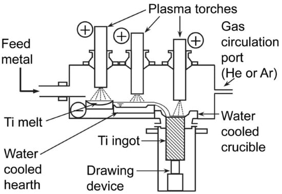 An intense and controllable stabilized electric arc discharge is used as a source of energy in PAM. The PAM process operates under a wide pressure range and inert atmosphere so that the melting process is not disrupted by the outgassing of feed material. Figure 10 shows a PAM process. VAR and EBM processes have limitations on the form and purity of material that can be processed. Electrical conductivity and structural integrity of the starting material is required in the VAR process. A constant vacuum for electron guns to function is required in EBM, which limits the amount of outgassing that can occur during melting. PAM offers the advantages of both EBM and VAR []. The advantage of PAM over EBM is its higher operating pressure of plasma systems (atmospheric or above) than EBM furnaces (Hard vacuum). The higher pressure in PAM helps avoid losses of low vapor-pressure alloying elements like aluminum and chromium []. Titanium-based alloys and nickel-based super alloys are widely used in aerospace industries, for example, in turbine compressor blades and compressor discs in jet aircraft engines. These materials, when molten, are very reactive and are susceptible to oxidation. The presence of small inclusions and other elements can lead to crack initiation sites. The PAF can carry out refining by removing high- and low-density inclusions during melting []. Blackburn et al. [] have discussed the plasma arc melting technology for titanium alloys. Modrzynski et al. [] recycled titanium alloys using PAF. Dunn et al. [] recycled high interstitial contaminated tantalum powder. One of the conclusions drawn was that, due to excessive outgassing in high interstitial content material, PAM is the only alternative for its melting. Dunn et al. [] used PAM to produce high quality ingots of titanium–tantalum alloys. Bhat. [] mentions in his report that service life of plasma torches with electrodes is limited due to various factors like the type of material used for electrode, design configuration of electrodes, reactivity with plasma gases, and the nature of the current, AC or DC.