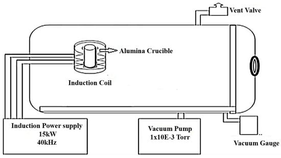 In induction heating, an electrically conducting part is heated by passing an alternating current at a specific frequency through a copper coil to generate a variable electromagnetic field; this generates an induced eddy current in the vicinity of the coil. The part is placed within the coil and the eddy currents flowing through the part’s resistance heats it due to the Joule effect. The eddy currents are developed due to the part’s resistance and results in power loss, which results in heat. Figure 11 shows a VIM system. The advantages of the VIM process are a short melting time, precise control, homogenous mixing, and low cost. Teke et al. [] developed a new melting system with vacuum induction to recover titanium alloy scraps. Figure 12 shows briquettes generated by pressing the Ti6A14V chips. Pereira et al. [] recycled zircaloy scraps using vacuum induction melting and electron beam furnaces to obtain ingots. VIM has been used as a part of the process for recycling titanium aluminide [,].