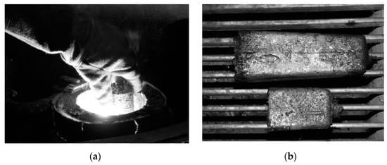 Stainless steel chips can be a source of alloying elements like nickel and chromium. Tokar et al. [] conducted an experiment by separating structural steel and stainless-steel chips using magnetic separation. Chips were cleaned using two degreasing methods: (1) using laboratory furnace, chips were heated up to 400 °C to burn volatile gases; (2) by washing chips in trichloroethylene, a waste organic solvent. Dry chips were obtained from these methods. Dry and degreased chips were manually cold pressed into cylindrical compacts, which were then melted in a 20 kg induction melting furnace (Figure 13). In total, 13.01% Cr, 6.34% Ni, 0.86% Mo, and 0.45%Cu was the composition obtained from the investigated chips. It was confirmed from the experiment that compaction of chips in the form of briquettes was necessary for getting a better yield of material in melting process [].