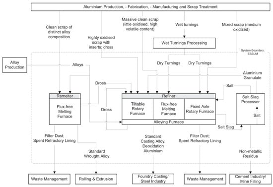Remelting technologies like vacuum arc remelting (VAR), electron beam melting (EBM), and plasma arc melting (PAM) are used for melting titanium scrap as they minimize oxygen contamination. Volatile impurities like sodium and magnesium can be removed using EBM, as it is operated under a high vacuum. A combination of these methods, like EBM and VAR or PAM and VAR, are used for remelting []. Reitz et al. [] recycled TiAl casting scrap by using vacuum induction melting, and detoxified it using pressure electroslag remelting. Vacuum arc melting was used to remove the dissolved reducing agents and impurities. Wang et al. [] studied the effects of time, temperature, and cutting fluid type on the ultrasonic cleaning of titanium chips. It was determined that, when using 40 kHz ultrasonic cleaning for 20 min and 5% sodium carbonate solution at 50 °C, an oil removal rate of 83.5% can be reached. The cleaning mechanism was analyzed, and influence modes were explained according to the young equation. The production yield and processing process of the titanium alloy is low, about 50%. It is difficult to cut material and produces many chips []. The degraded utilization method and remelting recovery method are used for recycling titanium containing waste materials []. One of the ways for recycling titanium chips can be by using it in the development of Ferrotitanium. Ferrotitanium is used in steel making []. Titanium improves the steel microstructure and its wear properties and tensile strength. Pure titanium cannot be directly added to steel as it will be burnt, and titanium oxide will form inclusions inside the molten steel, affecting its quality []. Hence, the aluminothermic method or electro aluminothermic method is used to add titanium to liquid steel to obtain ferrotitanium alloy [,]. The traditional production method uses rutile and low phosphorus sulfur titanium as raw materials, which makes it difficult to control impurities [,,], but by adjusting the proportion of ingredients, high titanium ferrotitanium can be produced by using titanium waste []. During processing and collection, the titanium chips can get contaminated by impurities like cutting fluid, dust, and mechanical oil. Oil stains such as lubricating oil, drawing oil, cutting oil, and anti-rust oil are difficult to clean from the titanium chip surface as they adhere to it, and this may lead to excessive carbon content in high titanium ferrotitanium after remelting []. High titanium ferrotitanium can be obtained by thoroughly cleaning chips. Jiao et al. [] used the molten salt electrolysis method for recycling titanium scrap by which high purity titanium was collected from the cathode. In the aluminum recycling industry, aluminum is recycled using remelters and refiners (Figure 15). Casting alloys and deoxidation aluminum is produced by refiners, while wrought alloys are produced by remelters. Different aluminum alloys have to be separated while recycling in remelters, whereas in refiners, different alloys can be mixed to alloy-specific scrap batches before the scrap is loaded into the furnace. The feed in the remelter is clean scrap, which is not coated or oxidized, while the feed in refiner furnace is oxidized and coated []. The advantage of remelting chips over not remelting is that when the metal is in molten state, it is possible to correct its chemical composition by removing impurities.