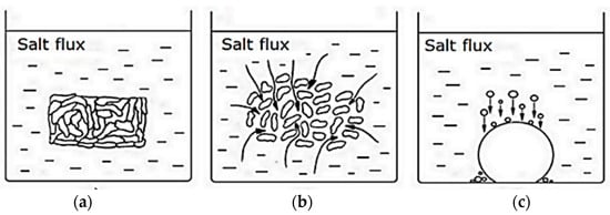 Stages of the compact’s melting process: (a) heating, (b) disintegration, salt penetration, beginning of coalescence, and (c) sedimentation and coalescence [].