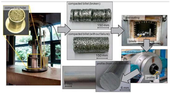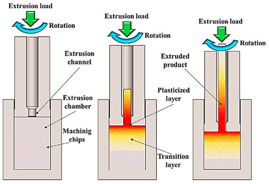 In conventional recycling, there is a low recovery of material. For example, in conventional recycling of aluminum and aluminum alloys, the material recovery is around 54%, as substantial losses occur during remelting due to its low density, losses during casting (risers, shrink holes), and processing of aluminum ingots, whereas 95% of metal is recovered during direct conversion []. This method of direct recycling can be applied to iron, copper, and aluminum alloys [,,,,]. The steps in the direct conversion method are comminution, cleaning, drying, cold pre-compacting, hot extrusion, and cutting to final size (Figure 17). The main requirement in recycling without remelting is that all the chips must be clean, homogenous in chemical composition, and should be from a single source. Low temperature processes are an alternative to the melting process. Here, a technique called sever plastic deformation [] is used by processes like friction stir extrusion [], cyclic extrusion compression [], high pressure torsion [], equal channel angular pressing [], and KOBO extrusion process []. The plastic-deformed material is converted into a semi-finished solid product, followed by an extrusion operation into a final product. Noga et al. [] recycled ALSi11 chips by compacting and co-extruding to obtain product in form of flat bars. Mathilde et al. [] recycled AA 6060 aluminum chips and observed that the oxygen content increased during every step of the recycling process. We have discussed below several plastic deformation techniques and the hot extrusion method.
