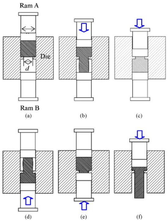 Schematic representation of the steps of the cyclic extrusion compression (CEC) process (a) initial state, (b) extruding with a pushing pressure on the Ram A, (c) end of Ram A, (d) reverse extruding, (e) end of Ram B, and (f) final extruding to obtain a rod [].