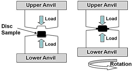 In the HPT process, a sample disc is placed between the upper and lower anvil and is squeezed under high pressure and is concurrently strained by rotating the lower anvil with respect to the upper anvil []. Figure 20 shows an HPT process. HPT was used by Aal for recycling of pure Al chip, Al chip-20% and Al chip-20% SiC, and was able to produce ultrafine grain microstructure samples with relative densities ranging from 99.7–98.3% []. Yusuf et al. [] applied HPT to additively manufactured SS316L fabricated using laser powdered bed fusion to produce ultrafine-grained and nano grained microstructures. Pandey et al. [] recycled AA 6082 chips into cylindrical solid bars and hollow components like ring bush using HPT. The density of solid bars was observed to be 95–98% of the actual material density. The microstructural study indicated good bonding of chips at interface. Nezhad et al. [] used HPT to recycle AA 7075 chips. They observed an improvement in mechanical properties with the addition of pure aluminum powder as a binder during the consolidation process, as it created lower porosity and better bonding between the chips. Castro et al. [] used HPT to fabricate different Mg-Zn composites at room temperature. Guo et al. [] hot-pressed Ti-5553 alloy chips and observed the strain to fracture of 0.98 ± 0.04%, ultimate tensile strength (UTS) of 675 ± 12 MPa, and bending strength of 1181 ± 28 MPa. Later, they double-aged samples at 600 °C for 4 h followed by 700 °C for 0.5 h, and they observed the strength and ductility of the hot-pressed Ti-5553 alloy to have significantly improved, with a UTS of 1425 ± 12 MPa, strain to fracture of 2.47 ± 0.07%, yield strength (YS) of 1390 ± 20 MPa, and a bending strength 2565 ± 35 MPa.