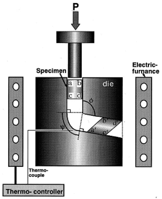 CEC is a type of sever plastic deformation (SPD) [] technique where a workpiece is pushed in a cylindrical die with two varying diameter sizes. Figure 19 shows a CEC process. Sever plastic deformation is used in the direct recycling of light weight and high strength materials; it produces material with ultra-fine grain size [] due to large plastic strain imposed during process []. The most crucial stage of direct recycling technique is the compaction stage as it affects the material properties and microstructure of the material. We have discussed billet compaction in Section 2.5. Low billet density is one of the issues with direct compaction. Shahrom et al. [] used cycling extrusion compression back pressure (CECBP) to improve the billet density which affects particle size, hardness, and chip boundaries of aluminum alloy 6061 chips during direct recycling of the hot forging process. Billet density, chip boundaries, and cyclic hardness were found to improve when aluminum chips were refined using the CECBP technique. Peng et al. [] applied CEC for recycling of GW102K (Mg–10Gd–2Y–0.5Zr) magnesium alloy. They used GW102K alloy in two forms (chips and ingot) for investigation. Richert et al. [] studied the effect of SPD during the CEC on strain hardening and grain refinement of AlMgSi (6082).