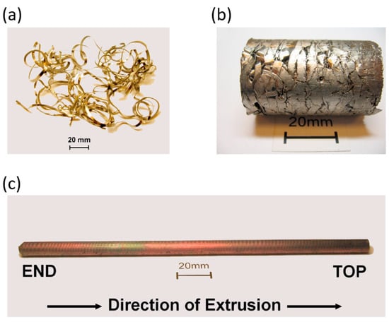 Images of titanium taken at the successive stages of the recycling process: (a) titanium chips obtained after machining, (b) briquette obtained after pressing, and (c) the final product after KOBO extrusion—solid rod with a diameter of 8 mm [].