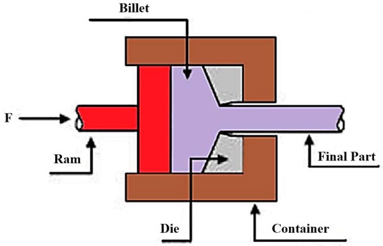 The scrap material is first compacted to form a billet. The billet is preheated before the extrusion []. The force applied on the ram pushes the billet on the die to extrude the part, as can be seen in Figure 25. Recycling aluminum using conventional methods using melting requires 25 times more energy than that needed for primary steel production. To overcome this problem, Pantke et al. [] recycled aluminum scrap of AA-7175 and AA-7475 using hot extrusion process without remelting. Haase et al. [] recycled machined AA6060 aluminum alloy chips using hot extrusion and subsequent cold extrusion. Taha et al. [] recycled AA6061 aluminum alloy chips using the hot extrusion process followed by equal channel angular pressing (ECAP) and observed enhancement in corrosion resistance of the material. Selmy et al. [] recycled AA6061 aluminum alloy chips using hot extrusion process followed by ECAP. Tekkaya et al. [] hot extruded AA 6060 aluminum alloy chips and investigated the effects of chip type and process parameters on the final mechanical properties of the extruded profiles. Al et al. [] recycled aluminum alloy AA6061 chips using hot extrusion and studied the effect of extrusion ratio and temperature on the microstructural evolution, physical, and mechanical properties of the material. Hosseini et al. [] recycled phosphor bronze chips using hot extrusion process using aluminum powder as a metal binder for the fabrication of metal-fiber-reinforced aluminum matrix composite. They studied the microstructure and analyzed the fracture mechanism as a function of the volume fraction of phosphor bronze chips in fabricated composite. Alimi et al. [] studied the effects of reinforcing aluminum AA6061chips mixed with boron carbide and zirconia particles. The results indicate that hardness and compressive strength increased with up to 5% added particles and beyond 5% the yield values decreased. The advantages and disadvantages of hot extrusion process have been provided in Table 1.