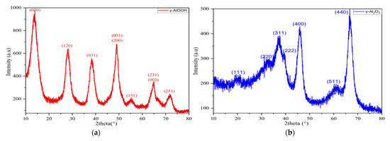 Figure 4 shows that the adsorbed volume of gas has increased from 160 cm3 g−1 (Figure 4a) to 220 cm3 g−1 (Figure 4b); an improvement in the specific surface area of γ-AlOOH is produced during its thermal conversion to γ-Al2O3, increasing from 298.35 to 403.31 m2 g−1. These values are higher than those reported for the synthesis of these two materials using aluminum waste as a precursor [7,15]. In fact, γ-Al2O3 with a specific surface area of 304.21 m2 g−1 was obtained from aluminum frame waste [7], while γ-AlOOH and γ-Al2O3 with specific surface areas of 115 and 300 m2 g−1, respectively, were obtained from paper pulp waste [15]. This variation in the specific surface area could be attributed to several factors, including differences in the precursor material, synthesis conditions such as the pH, temperature, and ageing time, as well as the calcination temperature. Indeed, the γ-Al2O3 obtained from calcination at 1000 °C has a high surface area compared to the γ-Al2O3 produced through calcination at 900 °C [9].
