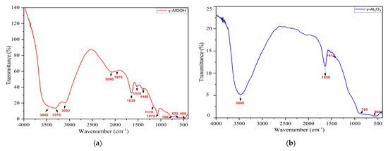 FTIR spectra of γ−AlOOH (a), γ−Al2O3 (b).