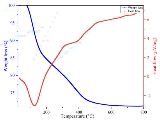The crystal structures of γ-AlOOH and γ-Al2O3 were analyzed using a Bruker (Billerica, MA, USA) diffractometer (D2 Phaser) with monochromatized CuKα radiation (λ = 1.541). Patterns were recorded in the 2θ angle range of 10° to 80° using the LYNXEYE detector (Lyncean Technologies, Fremont, CA, USA). Their surface functional groups were identified using a VERTEX 70v FTIR spectrometer (Billerica, MA, USA), and the spectra were collected within the range of 4000–400 cm−1, with a spectral resolution of 4 cm−1 and an average of 64 scans. Thermogravimetric and differential thermal analysis (TGA-DTA) was used to analyze the thermal stability of the pseudo-boehmite at temperatures ranging from 25 to 800 °C, using a Labsys evo thermal analyzer (Setaram, Lyon, France) with a heating rate of 5 °C/min. Scanning electron microscopy (SEM) combined with energy-dispersive spectroscopy (EDS) (JEOL JSM-IT500HR (JEOL Ltd., Akishima, Tokyo, Japan)) was used to determine the surface morphology and microstructure of the γ-AlOOH and γ-Al2O3 particles before and after adsorption. The nitrogen adsorption–desorption isotherms of both materials were collected using a Micromeritics Instrument (Micromeritics Gemini VII 1014 (Micromeritics Instrument Corporation, Norcross, GA, USA) operating at a liquid nitrogen temperature of 77 K, covering a relative pressure range of 0.001 to 0.998 to obtain the Brunauer–Emmett–Teller (BET) specific surface area. To calculate the EBT removal efficiency, absorbance was measured for each test after filtration using a UV-vis spectrophotometer (DR 6000 UV-vis (Hach, Berlin, Germany)).
