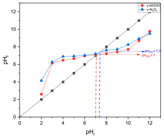 The point of zero charge (pHpzc) is an important physico-chemical parameter providing information on the phenomena occurring at the surface of adsorbents. At a pH below pHpzc, protonated adsorbent surface functional groups attract negatively charged adsorbates due to an excess H+. At a pH above pHpzc, the positively charged adsorbates are adsorbed onto the negatively charged adsorbent surface. Synthesized γ-AlOOH has a pHpzc of 7, while γ-Al2O3 has a pHpzc of 7.3 (Figure 6). These values are in good agreement with the results cited by [1,7,11].
