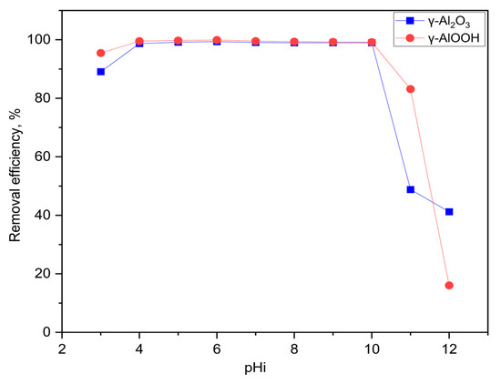 Effect of pH on the efficiency of removing EBT by γ−AlOOH and γ−Al2O3; Mass = 50 mg, C0 [EBT] = 50 mg L−1, V = 50 mL.