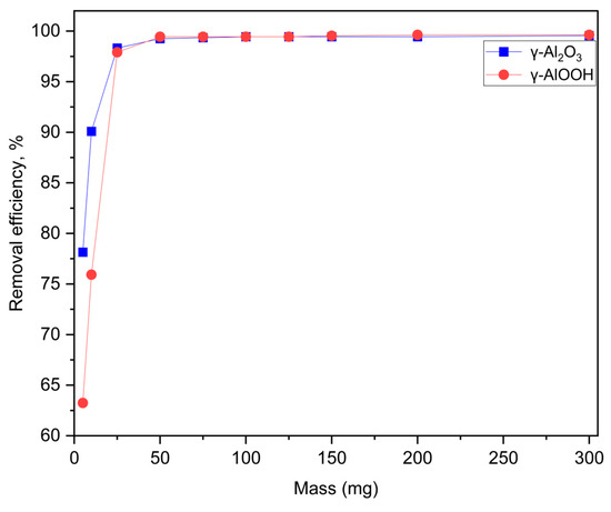 Effect of adsorbent initial mass (γ−AlOOH and γ−Al2O3) on the efficiency of removing EBT; Mass (5–300 mg), C0 [EBT] = 50 mg L−1, V = 50 mL.