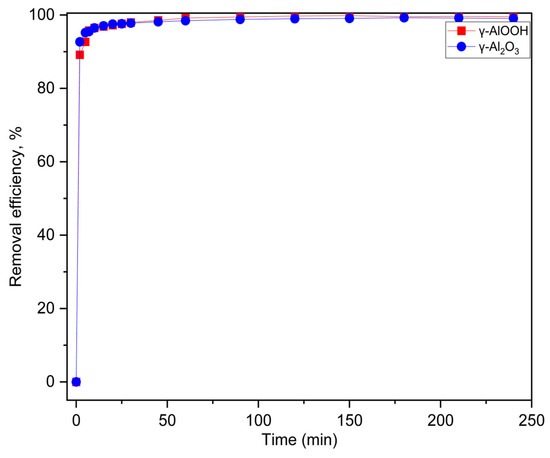 Figure 9 illustrates the effect of contact time on EBT adsorption by γ-AlOOH and γ-Al2O3. EBT adsorption follows rapid kinetics, reaching a near-equilibrium state after 20 min for both adsorbents. This could be justified by the availability of active sites for molecule binding and/or the high adsorbate/adsorbent affinity.