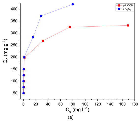 As depicted in Figure 11a, the adsorption isotherms of γ-AlOOH and γ-Al2O3 for EBT are type L. The adsorption capacity of γ-Al2O3 is significantly higher than that of γ-AlOOH. Given that both adsorbents have a comparable surface chemistry and adsorb the same dye molecule (EBT), this difference could be explained by the greater specific surface area of γ-Al2O3. The adjustment of the experimental data to the Langmuir and Freundlich models is shown in Figure 11b,c. The Langmuir isotherm in its linear form is considered most appropriate because it provides a better fit with the highest (R2 = 0.99) compared to the Freundlich model, which had a correlation coefficient of about 0.96 (Table 3). This result could be identified with the monolayer adsorption of the dye. The maximum adsorption capacity (qm) calculated for the Langmuir model is of the order of 344.44 mg g−1 and 421.94 mg g−1 for γ-AlOOH and γ-Al2O3, respectively. Similar monolayer molecule-binding behavior was obtained for the removal of Congo red molecules using γ-AlOOH [1] and Methyl orange molecules using γ-Al2O3 [28].
