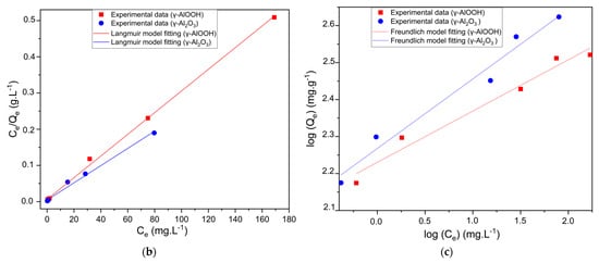 Adsorption isotherms of EBT adsorption onto γ−AlOOH and γ−Al2O3 (a); modeling of the adsorption equilibrium by Langmuir (b) and Freundlich (c) isotherms.