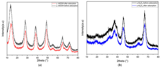 Figure 13a,b illustrates the XRD patterns of γ-AlOOH and γ-Al2O3 before and after adsorption; it can be seen that the peaks remain almost in the same 2θ positions, with a slight decrease in the peak intensity. This could indicate that only physical adsorption is involved and that there is no possible ion exchange phenomenon.