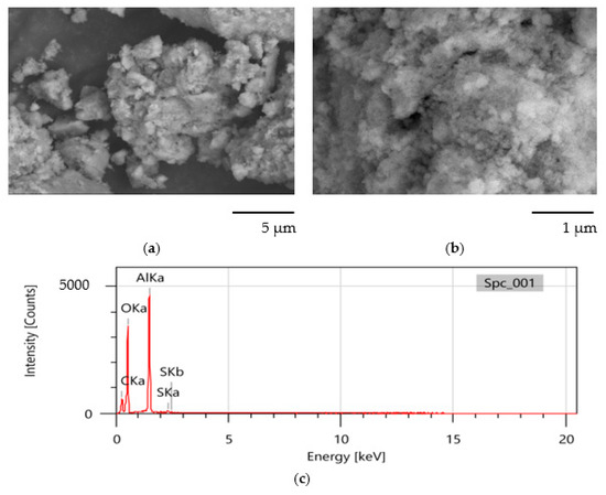 In order to examine the morphology of γ-AlOOH and γ-Al2O3, the samples were characterized by SEM (Figure 5). The particles appear as non-rigid aggregates forming clusters with a flake-like structure, with some tiny particles also detected. Similar morphological characteristics have been observed in the literature [7,10]. In addition to SEM analysis, EDS analysis was carried out. The chemical composition of the γ-AlOOH (Al wt.%: 51.6 ± 0.8; O wt.%: 48.3 ± 0.7) and γ-Al2O3 (Al wt.%: 54.6 ± 0.9; O wt.%: 45.3 ± 0.7) synthesized from the sludge shows that both products exhibited high purity.