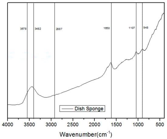 The dishwashing sponge FTIR is a type of contact-mode Fourier-Transform Infrared Spectrometry (FTIR), which is used to measure the absorption of infrared radiation by a sample’s molecular bonds. With an instrumental bandwidth between 3678 and 3482 cm−1, this instrument is able to make conclusions about the various molecular bonds in the sample based on how much energy is being absorbed. At 2887 cm−1, we can observe a vibration in the spectra, most likely due to the stretching of a single bound between two atoms-OH stretching in a water molecule, for example in []. This would indicate the presence of hydrogen-bonded OH groups in the sample. Peaks located at 1650, 1107, and 948 cm−1 would indicate the presence of C-H vibrations, C-O vibrations, and C-C vibrations alike. These chemical features impart different information about the sample, which can help the researcher conclude prevailing properties about the sample. For example, the CH peak would indicate the presence of aliphatic hydrocarbons and the C-O peak could indicate the presence of esters, alcohols, or ketones. Oftentimes, more than one annotation can be made from a single peak, which may require further research or confirmation. The C-C peak could reveal the presence of aliphatic or aromatic carbons, which could suggest the presence of a particular type of hydrocarbon []. In sum, the dishwashing sponge FTIR provides a temporal snapshot of the molecular interactions in the sample. The various peaks can then be parsed to determine the prevailing molecular connections, inspiring further inquiry into the sample’s properties.