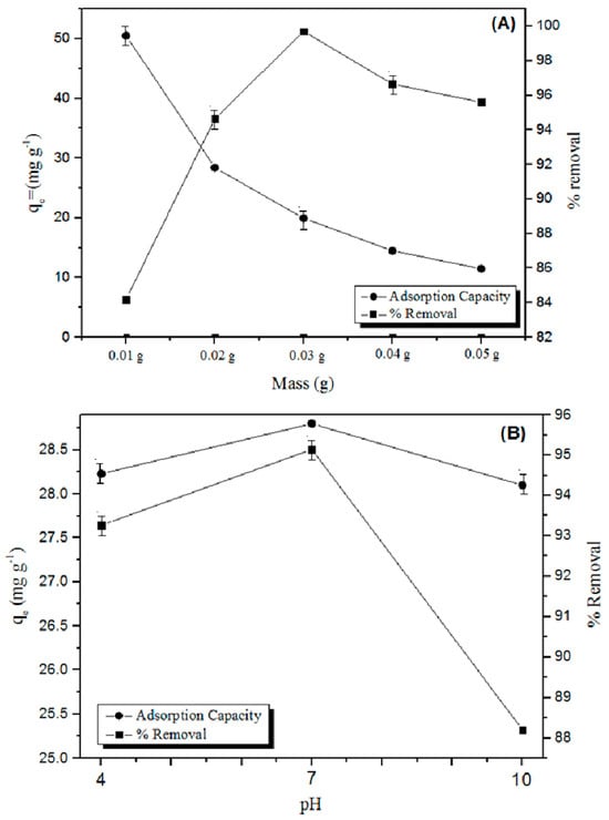 In Figure 4B, pH is a measure of hydrogen ion concentration and is an important factor in the adsorption of particles onto a surface. Specifically, higher pH values indicate a higher concentration of hydrogen ions in the solution, and this higher ionic strength can lead to higher rates of adsorption. When pH is equal to or less than 4, particles tend to become more hydrophilic (water-loving) and, therefore, less prone to adsorption. On the other hand, when pH is equal to or greater than 7, particles tend to become more hydrophobic (water-repellent) and, thereby, more prone to adsorption. In this case, the adsorptive capacities at pH 4, 7, and 10 were 28, 29, and 27.5 mg g−1, respectively. Since the capacity at pH 7 was the highest, we can conclude that this pH value provided the most favorable conditions for adsorption onto the surface []. The lower capacity at pH 4 and 10 may reflect either an unfavorable hydrophobicity/hydrophilicity ratio or a lower concentration of hydrogen ions.