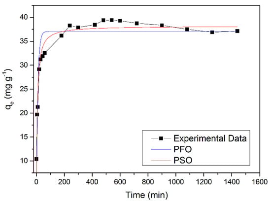 The kinetic and equilibrium studies of the effect of dosage (0.01 g of sponge) and pH (7) on the adsorption of paracetamol onto sponge material was investigated in a laboratory set-up. The experiments were conducted at room temperature (25 °C) in a batch reactor with 30 mL of paracetamol solution at a concentration of 60 mg L−1, with a stirring speed of 120 rpm, while pH was maintained at 7. Samples were collected at specific intervals (namely from one to 1440 min) and filtered through cellulose acetate membranes, in Equation (1):