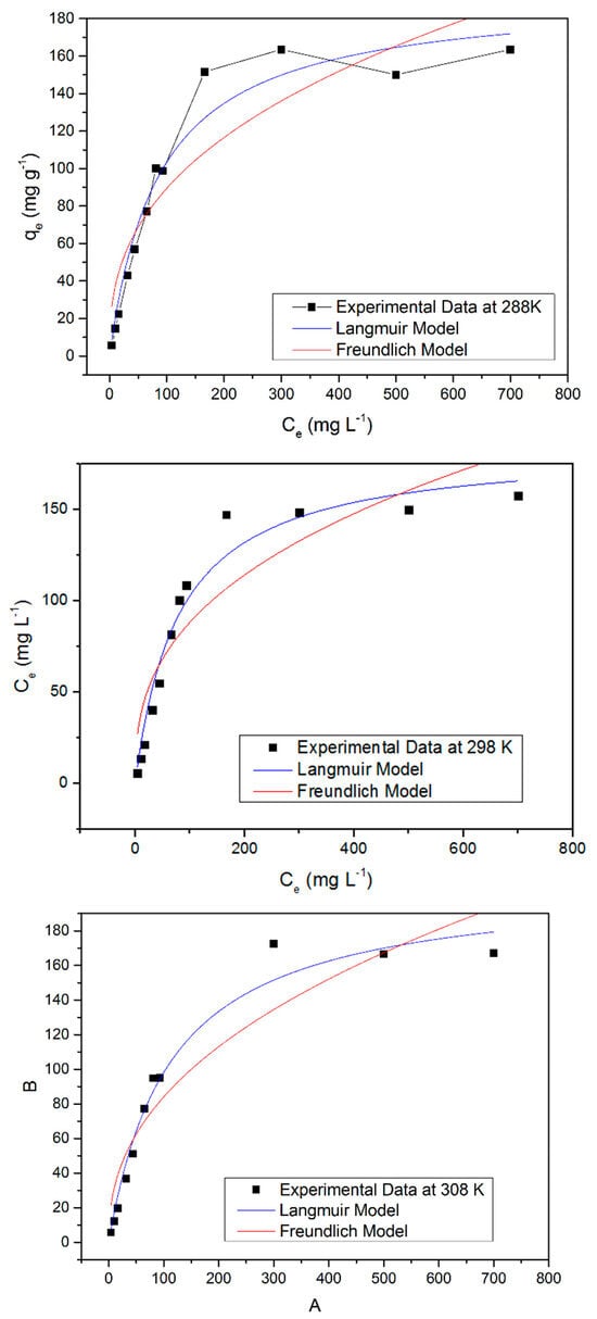 Adsorption isotherms were studied to assess contaminant removal at various concentrations at temperatures of 288, 298, and 308 K, as shown in Figure 6.