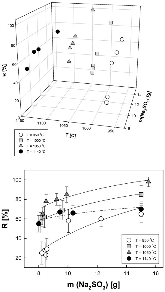 To validate the observations, a more detailed kinetic analysis was performed for the process at 1050 °C. The partial orders of the reaction with respect to sodium sulfite and carbon were determined via the unweighted linear regression analysis of the dependencies between logarithms of the normalized average reaction rates and logarithms of normalized molarities of either sodium sulfite or carbon (Figure 3). The average reaction rate is directly proportional to R/Δt, where Δt is the duration of the smelting process at the given temperature. The numerical results obtained are as follows: 0.81 ± 0.32 for sodium sulfite and −1.05 ± 0.82 for carbon. The numbers after the ± sign represent expanded uncertainties (with a coverage factor of 2) of the determined kinetic parameters. The negative partial order of the reaction indicates that the concentration of that species inversely controls the overall reaction rate and suggests a complex mechanism of the reduction process. The mechanism may involve a reaction step that proceeds at the phase boundaries limited by the adsorption/desorption rates. It is also possible that one of the final products of the reduction process is involved in another step of the reaction mechanism.