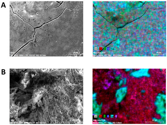 SEM images and elemental mapping of surfaces of tin samples obtained for the systems composed of 15.0 g of SnO2, 10.1 g of Na2SO3, 5.0 of g charcoal at 1050 °C (A) and 15.0 g of SnO2, 5.2 g of Na2SO3, 5.5 g of charcoal at 950 °C (B).