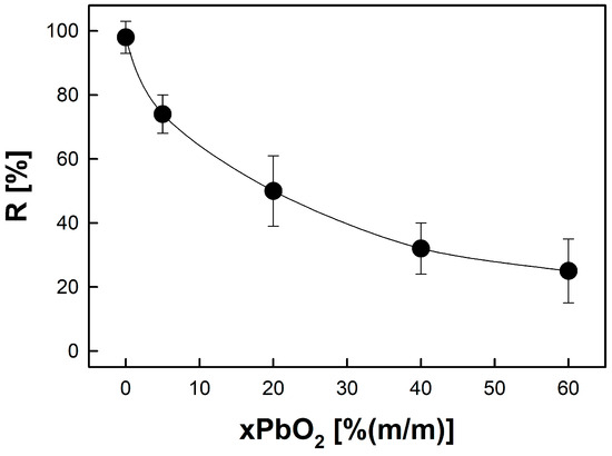 The interfering effect of lead or copper is related to the fact that lead and copper (e.g., present in the oxide forms) react preferably with sulfur-bearing fluxes (carbonyl sulfide, elemental sulfur) at higher temperatures, producing lead or copper sulfides. These reactions would consume a significant part of the reducing agent and result in the decrease or even termination of the tin smelting process. The results of experiments performed for SnO2 and PbO2 mixed at various mass ratios, presented in Figure 4, led to the conclusion that the use of the method results in an acceptable yield of tin (more than 70%) if the level of lead impurities does not exceed 5%.