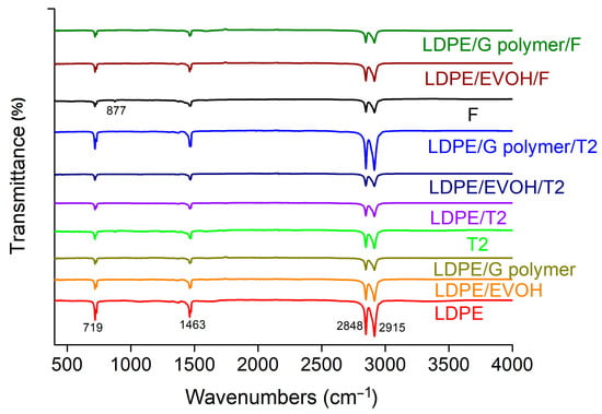 The surface FT-IR measurements of all samples, including virgin and recycled materials, are shown in Figure 1. All samples show significant peaks (2915 cm−1, 2848 cm−1, 1463 cm−1 and 720 cm−1) that can be attributed to LDPE (also see Katsara et al. [19] and Lin et al. [20]). However, when comparing the individual measurements, no difference was found between virgin and recycled material (T2 and F), and EVOH and G-polymer could not be detected in these analyses. Among all the measurements, only one sample (F) showed an unidentifiable peak at 877 cm−1. The peak of sample F, which consisted of a recycled monomaterial based film, indicates possible contamination. Due to the very low intensity of the peak, the degree of contamination is also considered to be low.