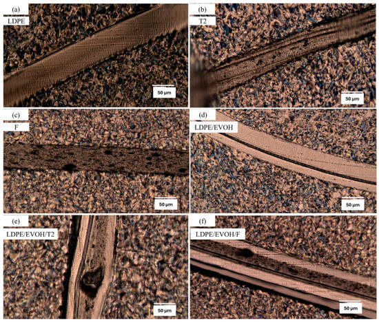 Surface images of the mono- and multilayer/functional barrier samples. These images are intended to reflect the distribution of particles in recycled films. There are no particles in image (a) LDPE virgin and image (d) LDPE/EVOH. In comparison, the distribution of particles can be seen in images (b) T2, (c) F, (e) LDPE/EVOH/T2 and (f) LDPE/EVOH/F.