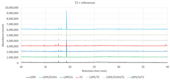 GC-MS chromatograms for samples containing the recycled material T2.