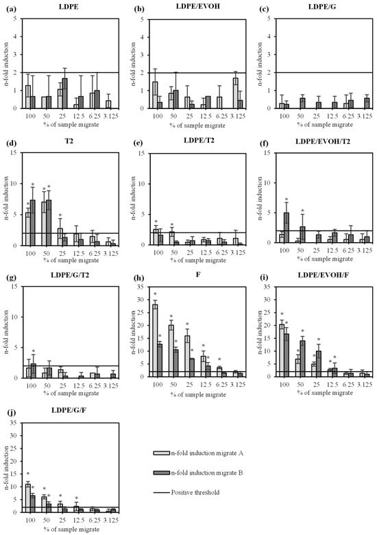 Comparison of the n-fold induction of the ten tested samples from Table 4. The diagrams show the results with bacterial strain TA98 +S9 for migrate A and B. Diagram (a) shows a virgin LDPE reference film, (b) consisted of virgin LDPE with an EVOH layer and (c) consisted of virgin LDPE with a G-polymer layer. Diagram (d) shows a recycled LDPE reference film called T2, (e) consisted of T2 and LDPE layers, (f) consisted of T2, LDPE layers and an EVOH layer and (g) consisted of T2, LDPE layers and a G-polymer layer. Diagram (h) shows a recycled LDPE reference film called F, (i) consisted of F, LDPE layers and an EVOH layer and (j) consisted of F, LDPE layers and a G-polymer layer. The x-axis label ‘% of sample migrate’ refers to the sample concentration (dilution) of the migrate. Bars marked with a star (*) indicate a positive result for mutagenicity. The error indicators show the standard deviation of each sample in a triplicate determination. A positive result is achieved if the n-fold induction exceeds two, denoted by the horizontal lines.