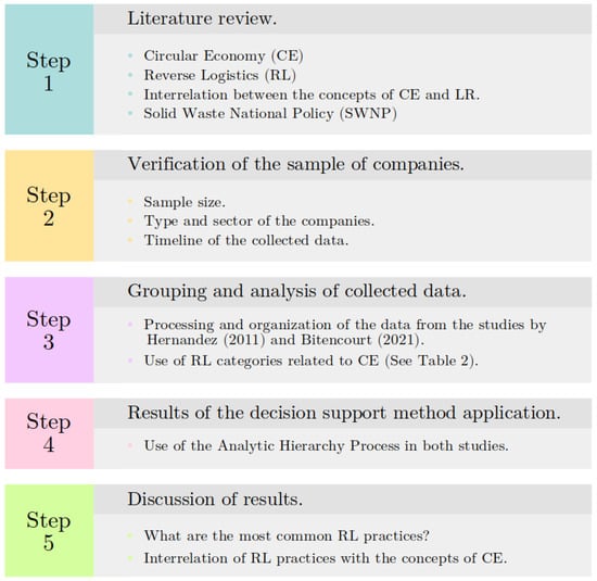 - Exploratory: The literature review focused on interrelating concepts of CE and RL linked to the NSWP. Subsequently, qualitative and quantitative data collected by Hernández [36] and Bitencourt [54] were processed and organized to analyze the relationship between RL and CE and to determine if there were changes after the implementation of the NSWP. Although two cases were selected for the study, the research is not considered a multiple case study because there is no in-depth investigation, which, according to Miguel [55], is characteristic of longitudinal research with more extensive temporal analysis, something that is not the aim of the present study.
