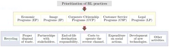 - Hierarchy Structure: Figure 2 depicts the hierarchical tree representing the RL practices identified in the surveyed companies (categories from Table 3). For applying the AHP, the levels of the hierarchical structure are represented by objectives or goals, programs, and activities. Therefore, in the models that will be analyzed, RL programs or drivers represent the criteria, and RL activities represent the alternatives of the method.