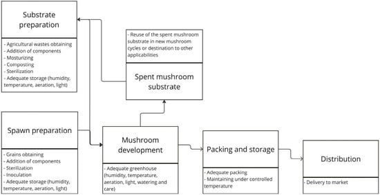 The main practical steps/segments of mushroom cultivation are the selection of the mushroom species, securing a good-quality fruiting culture, mushroom spawn production, substrate preparation, care of spawn running, and mushroom development and harvesting [20]. A flowchart was developed to summarize the general aspects of mushroom production (Figure 1).