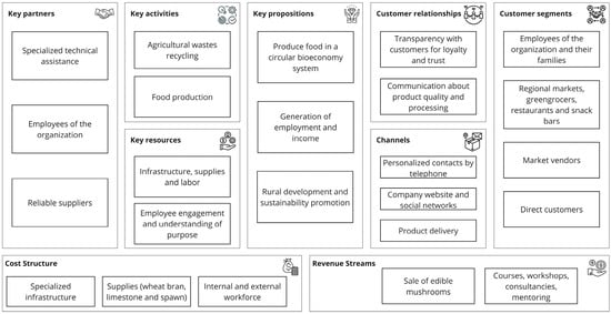 This study aims to create a business model using the BMC tool, which outlines the key elements of a mushroom production supply chain that need to be visually understood and feasible for farmers and companies. Understanding the principal elements of the business can encourage farmers and companies to produce food in a circular bioeconomy, promoting rural development and sustainable food practices. The business model was theoretically and strictly elaborated according to the recommendations of Osterwalder and Pigneur [25] and its association with the Sustainable Development Goals (SDGs) was discussed within recent studies.