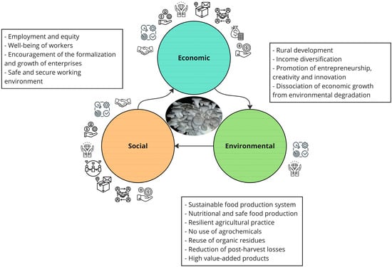 The BMC for edible mushroom production can be associated with the SDGs (Figure 3) as it permeates the environmental, economic, and social pillars of sustainability. The symbols are from the BMC, to which aspect of sustainability they belong.
