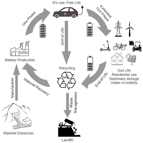 - Ahmadi, L.; Young, S.B.; Fowler, M.; Fraser, R.A.; Achachlouei, M.A. A Cascaded Life Cycle: Reuse of Electric Vehicle Lithium-Ion Battery Packs in Energy Storage Systems. Int. J. Life Cycle Assess. 2017, 22, 111–124. [Google Scholar] [CrossRef]
