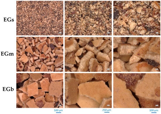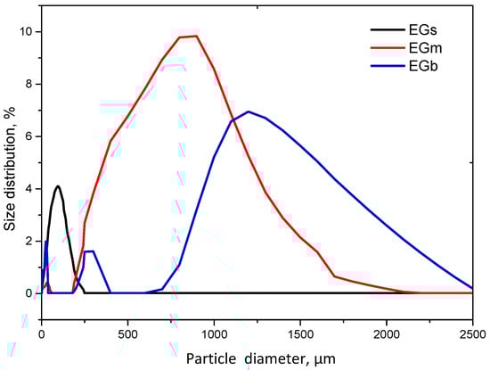 EGs, EGm, and EGl were characterized by average particle sizes of 67, 711, and 747 µm, respectively. The particle distributions shown in Figure 1 reveal significant differences in particle sizes.